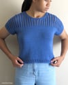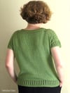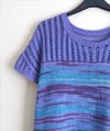 Summer in a Box is a boxy top-down T-shirt featuring a simple lace pattern in the upper part of the yoke and a narrow horizontal lace panel at the back. You can make your Summer in a Box with short sleeves or sleeveless, using cotton or bamboo yarn for hot weather, or wool for colder months.