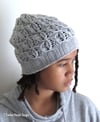 Frost Doodles hat combines lace and cables creating interesting texture. It is worked bottom up, starting with provisional cast-on. When the provisional cast-on is removed, the brim is finished with an attractive stretchy bind-off. There are two sizes: the smaller size fits a child with up to 53 cm/21 in head (approximately 3-10 years), the larger size fits an average adult head.