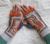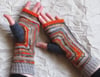 The mittens are worked in irregular stripe pattern and are a perfect way to use small amounts of yarn left over from other projects: I made mine with tiny balls of Miss Babs Yowza.
