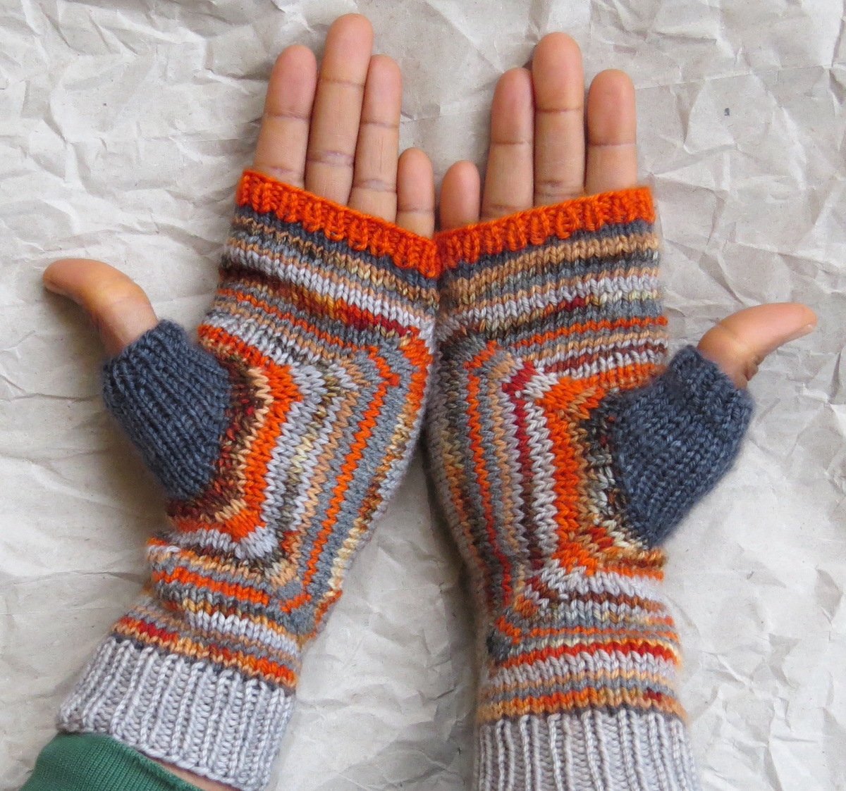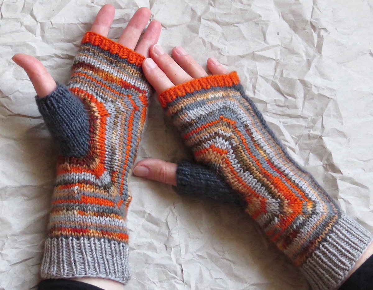 The fingerless mittens are knit starting from the thumb that is shaped with short rows at its base. The hand is worked around the thumb, forming a square. When it reaches the desired width, the square is folded and its two sides are joined on the bind-off row.